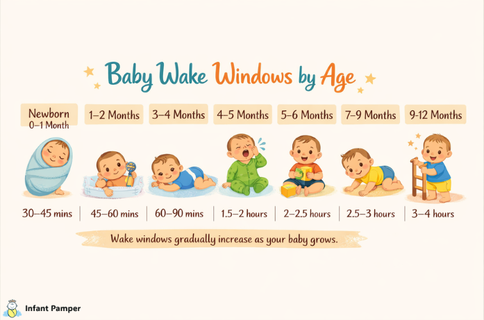 Baby wake windows by age gradually increase as babies grow. Newborns may stay awake only 30–45 minutes, while older babies around 9–12 months can stay awake for about 3–4 hours between naps.