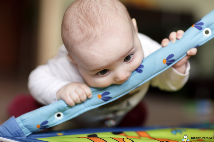 If a baby tries to bite your skin while playing, immediately redirect them to something safe, such as a teething toy or a cool cloth. The urge to chew is calmed by the removal of the urge, while the baby is taught not to bite people.